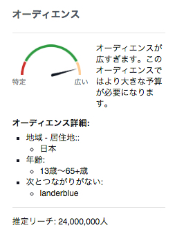 推定リーチは2400万人。で・・調べたら1年前の9月にFacebook日本の岩下氏がイベントでアクティブユーザー数を発表してました。月に1回はログインする人約2,100万人、毎日1回はログインする人約1,400万人。つまりほとんど増えてない感じ。