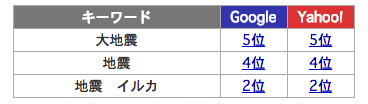 しかし「地震」となると超ビッグキーワードで、検索される回数が比じゃないわけですね。1日に10万単位での検索流入はいままででいうと