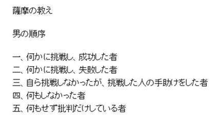 だいたいこういう格言書いたヤツって人生に成功したんだろうか。でも金持ちになったり、社会的な地位が上がったって人生に成功したって言えるのか。東電の社長も総理大臣も人生の成功者かといったら相当謎ですよ。孫さんだって、あれだけネットで禿、禿いわれたら自分だったらノイローゼだ。 金と名誉が人生の成功と思う価値観自体が古いような気がするが、おっさんだから仕方ないんだな。しかし・・