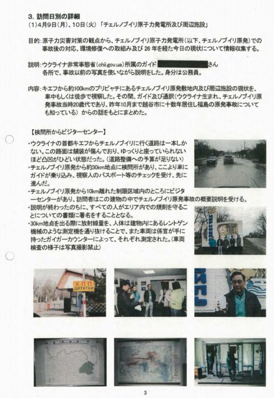 海外視察においては1日ごとに写真入りで報告され、写真もたくさんあります。惜しむらくは報告書に実際にかかった費用がついていないこと。精算書をセットにして報告書にしてほしいものです。チェルノブイリにも行っていました。