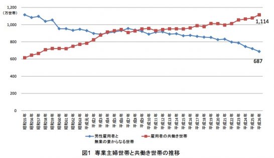 平成3年あたりから共働きが増えて専業主婦率が下がってきています。しかしその前の時代の記載がないのでこれだけ見ると誤解してしまう。