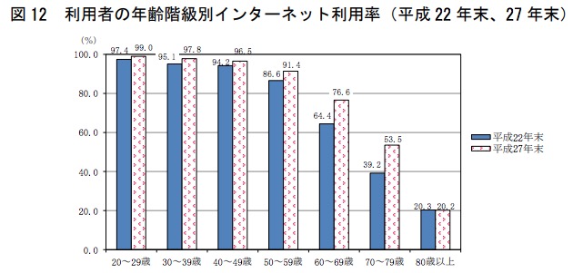 ネットの利用率は50代まではそれほど差がないが、60代になると一気にリテラシーは落ちる。