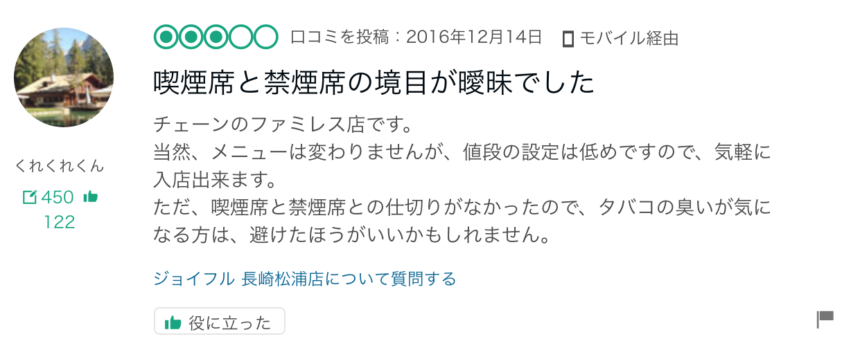 ジョイフルは敷居もないナンチャッテ分煙で、しかも喫煙席が異常に多いことで有名です。喫煙率はもう18%なのに禁煙と喫煙が半々とか・・・ww