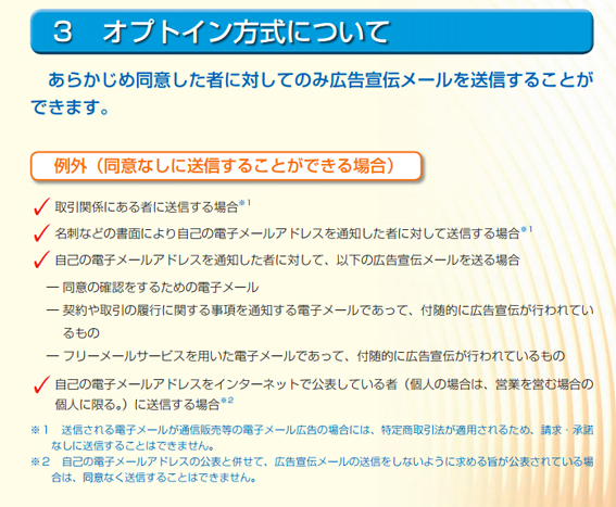 この例外規定は、そもそもメール配信さえ出来ないと営業自体が成り立たないという観点から定められている。大量にメルアド買ってはスパムを打ちまくる犯罪者のためのものじゃない。