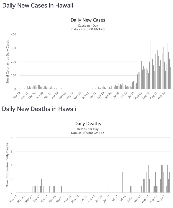 2週間詐欺というのが岡田晴恵さん中心にありましたが、感染のピークでは綺麗に2週間で死者が急増しています。たとえばできるわけもない早期抑え込みに失敗して阿鼻叫喚で二度目のロックダウンしたハワイがこちら。ロックダウン意味ないのに。
