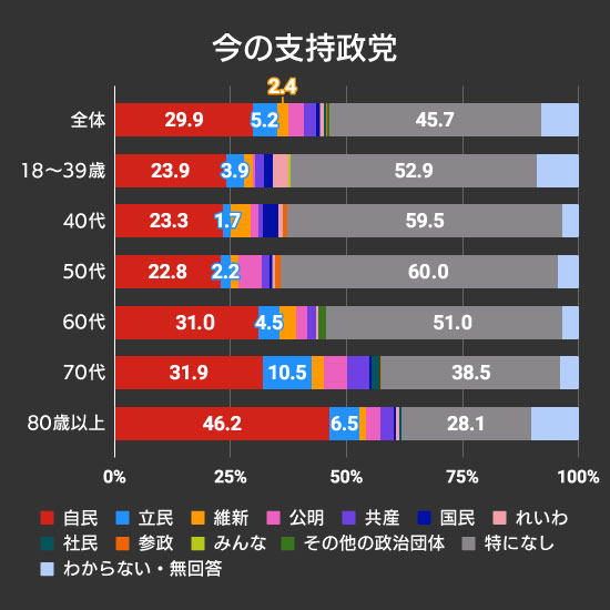 という構図が浮かび上がります。野党支持層では高齢者層より少ないたった13%しか経済に興味がない。これは野党を支持している層は若者も高齢者も揃って経済どうでも良いと考えていることになりますよね。