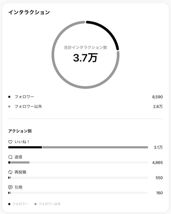 わたしの例が非常に分かりやすいのは、Xが11745人、Threadsが5547人とXがThreadsの2.11倍。ほとんど2倍なのですわ。もちろん投稿している内容はXとThreadsでウケるものが違うわけで、同じ物を投稿したり別のことを投稿したりもありますので全く同じには測れません。あくまで目安です。