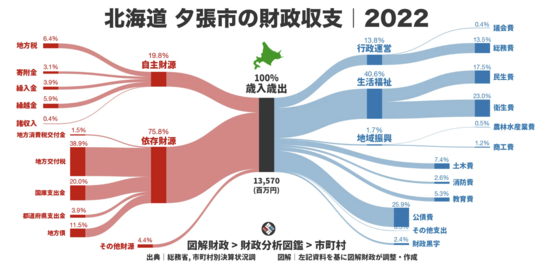 自主財源が2割もなく、国や北海道からの補助金に依存しています。支出を切りまくってもこれなのでいずれ近いうちに消滅するでしょう。人口はピークの1/18まで減少。もはや市を名乗る規模ではありません。