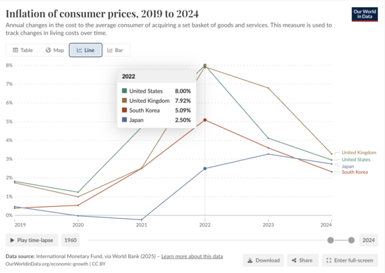 米英のインフレ率8%、遅れて開国した韓国も5.1%まで騰がった。