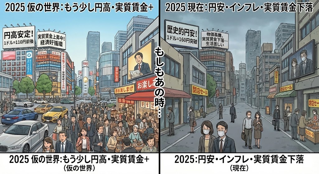 → 円は実績より5〜10%程度は円高寄りで推移していたと考えるのが自然(ただし150→100みたいな大逆転までは想定しづらい)、この「5〜10%の差」は、先ほどの「10%の円安がインフレ率を0.3%ポイント押し上げる」という試算とも整合的です。
