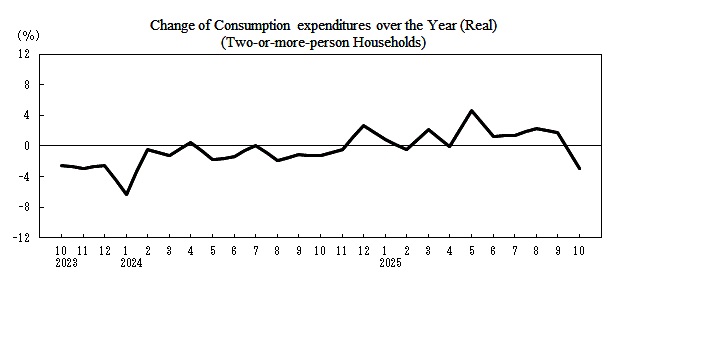令和7年10月の一世帯当たり月間消費支出平均は30万6,872円となり、名目では前年同月比0.3%増、実質では3.0%減