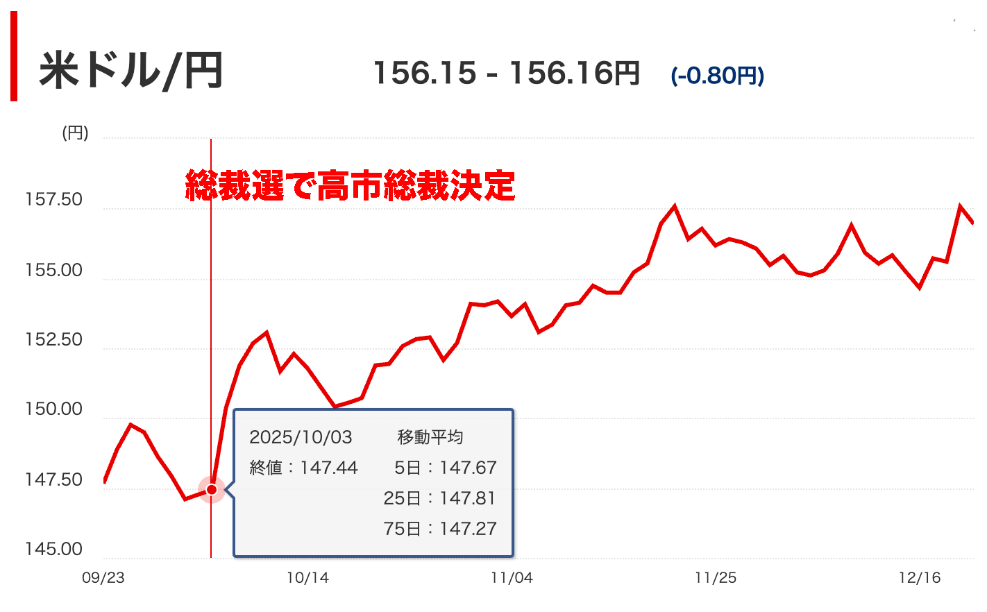 総裁選で高市さんが勝利した日から円は下がりはじめました。「赤字国債発行して積極財政」というキャッチフレーズが市場で日本のリスクが高まったと受け止められているからです。