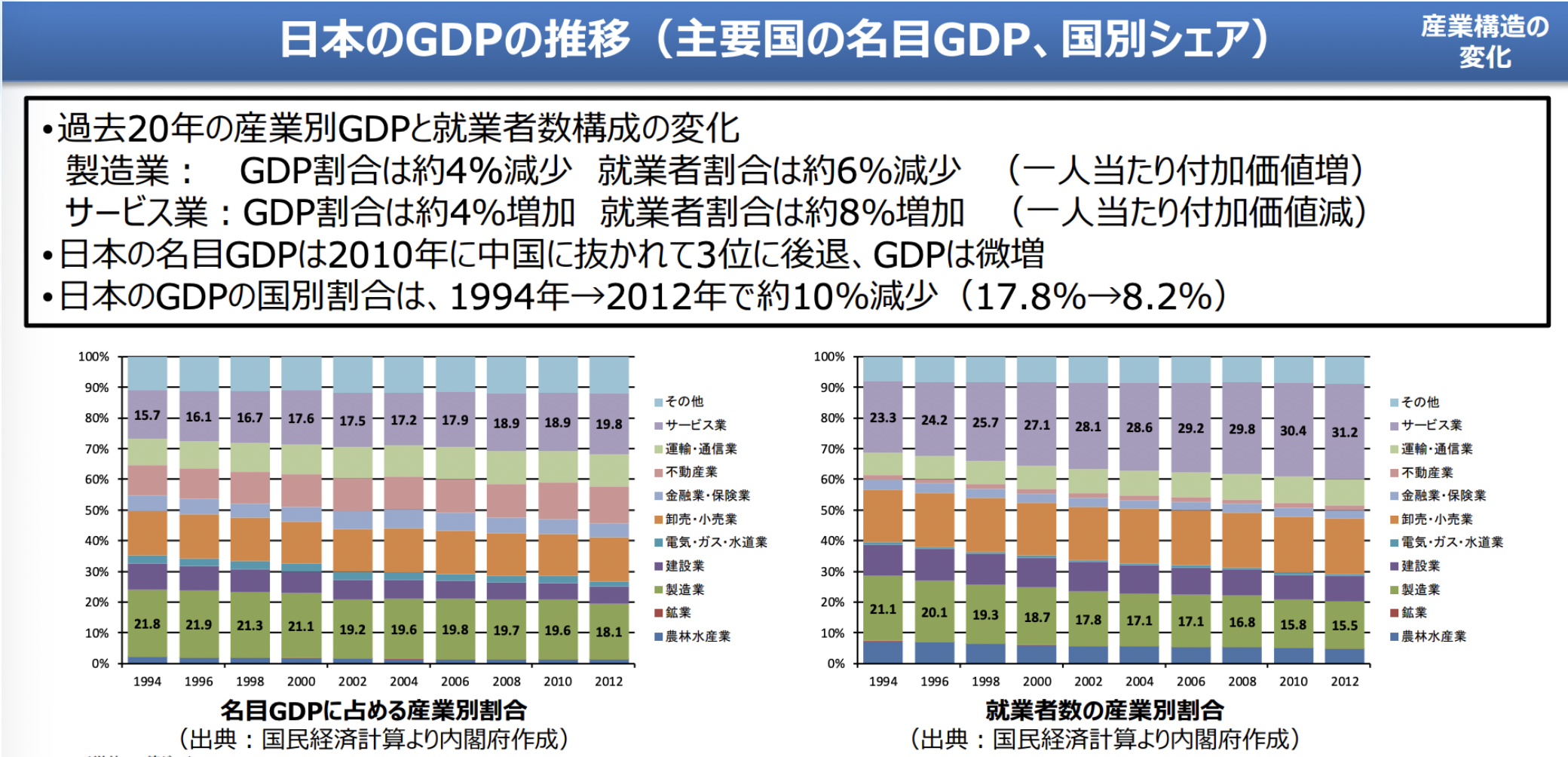 このグラフは2012年までですが、そもそも製造業が日本のGDPに占める割合は2012年以降少し持ち直しましたがそれでも20%強って感じです。就業人口に至っては機械化、効率化でどんどん減り続けています。