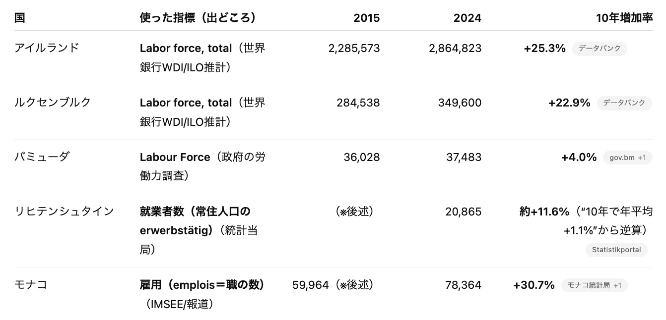 ここで1人あたりのGDPが世界ランク5位の国の過去10年の労働人口の増加率を出してみました