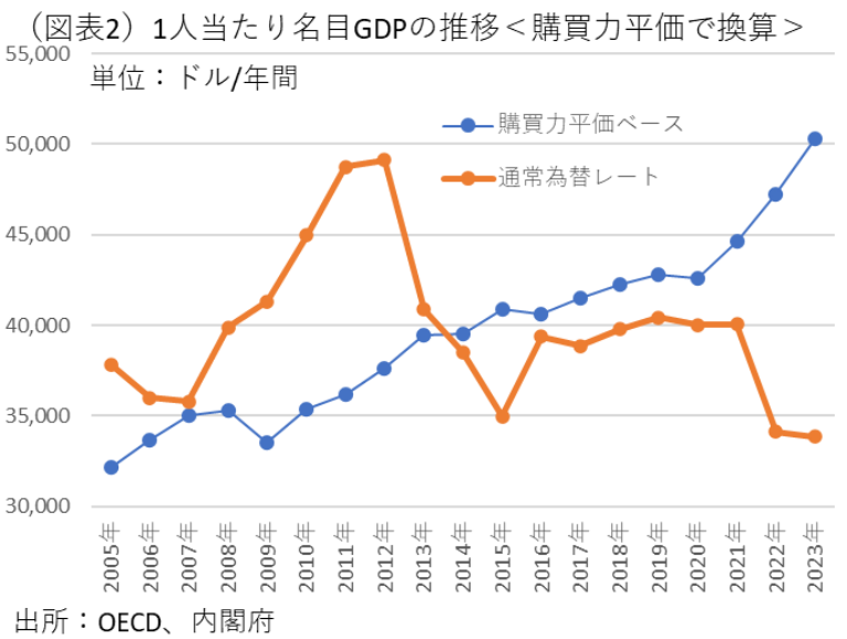 2位だったときの円ドルは85円。いまは160円手前ですから円の価値は半分近くに下落しました。しかしそれだけではありません。仮にいま1ドル120円になったとしても日本はだいたい「世界36位」くらい。