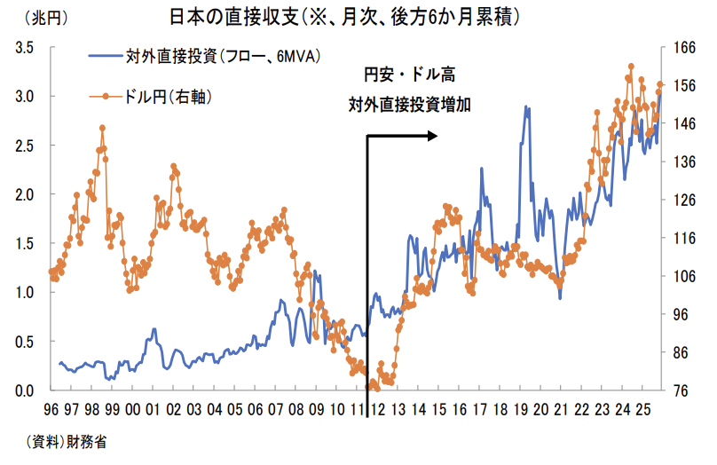 問題は演説全体を通じて「円安になると国内投資が戻ってくる」という認識が貫かれているように見える点だ。国内投資が積み上がっていく結果として、「為替にびくともしない経済構造」が醸成されるという主張である。演説は民主党政権時代の超円高を引き合いに出した上で「企業が出て行ってしまった。失業率も高かった」と述べているため、「円安になるとその逆のことが期待できる」と述べているように見える。実は、Xの釈明投稿でも円安が経済に与える前向きな影響について、一般論と断ったうえで「国内投資が進み、国内で生産した製品が海外に輸出しやすくなること」に加え、「外為特会の外債の運用等、利子・配当などの海外からの収入も改善する」と述べている。やはり高市首相は「円安で国内投資が増える」ことに関して期待を抱いているのだろう。残念ながら、これは前時代的な発想である。