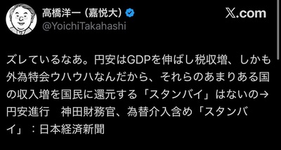 本気で円高がいいのか、円安がいいのかわからないのならもう総理なんて辞めて頂いた方が良いです。高市さんの言ってることは師匠と仰ぐ高橋洋一のいうことそのまんま。喩えもそのまんま。