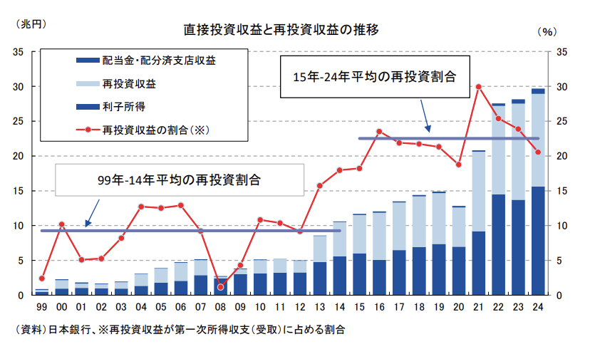 多くの日本企業は国内回帰を進めず、また、対外直接投資から得られた収益を外貨のまま現地に再投資してしまう傾向を強めている(下図)。こうした事実は国際収支統計上、明確に確認されてきた事実であり、2024 年 3~7 月に設置された財務省の有識者懇談会「国際