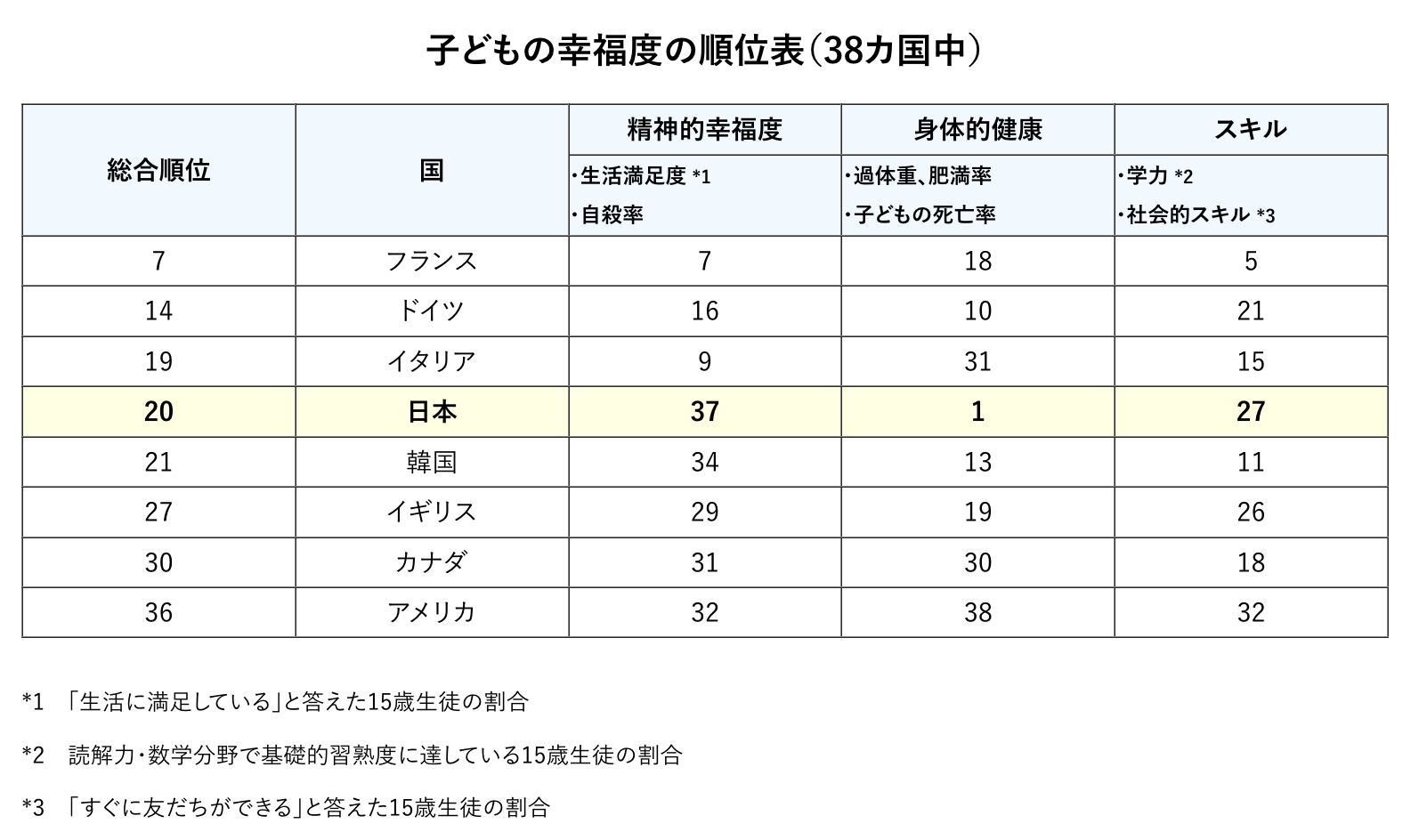 まずユニセフの調査で日本の子どもの幸福度は38ヵ国中37位